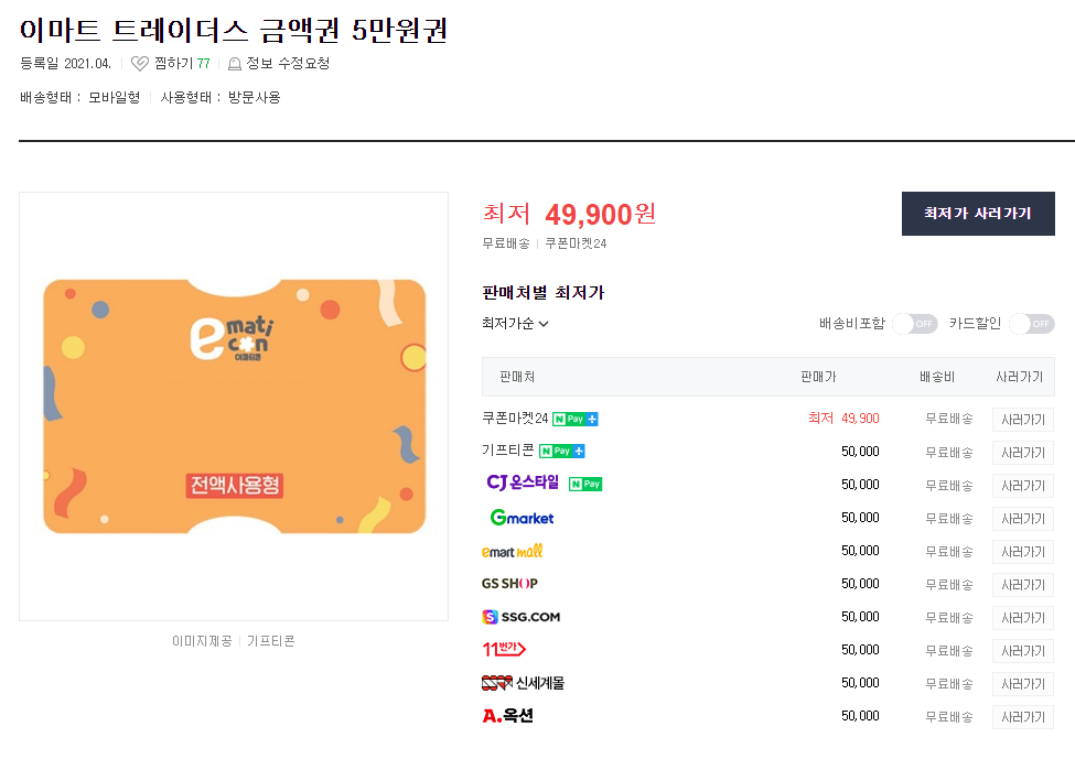 물론 상품권 거래하면 현금영수증은 할수 있지만 카드 실적이나 할인을 받지 못하는 상황이 생겨서 구입하고자 하는 상품거래정보를 확인한 후에 구입하는걸 추천합니다. 요즘처럼 경기가 안좋을때 생필품은 어쩔수 없이 구입해야 하잖아요. 그래서 할인정보를 찾으시는 분들에게 조금이나마 도움이 되셨으면 합니다.