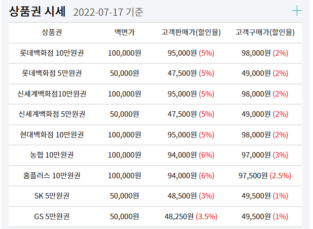 팔때랑 살때 할인율이 틀리죠. 업체도 먹고 살아야 하니 할인율 폭이 마진인거 같습니다. 그리고 가격과 지역마다 상품권의 시세가 조금씩 틀립니다. 상품권이 많이 거래되는 곳일수록 할인율이 높은거 같습니다. 롯데백화점10만원 경우 구매가는 2% 할인을 받지만 제가 자주 가는곳에서는 2.5%까지 나오더라구요(매일 변경됨) 그래서 자주 가는 곳을 만들어 놓으면 당연히 좋고, 방문전에 할인율을 물어 보시는것도 좋은 방법입니다.