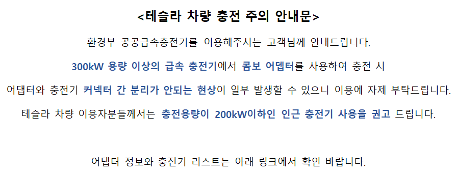 환경부 무공해차 통합 누리집에 공고된 테슬라 차량 충전 주의 안내문 입니다. 테슬라 슈차를 이용하시는 분들이라면 패스하셔도 될듯 하지만 고속도로 휴게소나 급속 충전을 이용하시는 분들이라면 참고해봐야 겠네요.